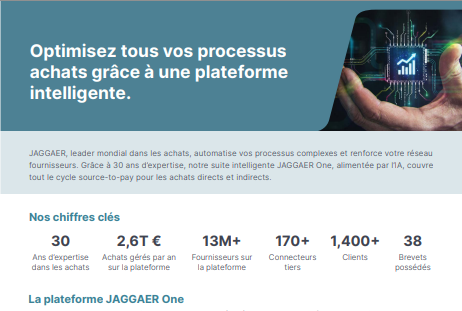JAGGAER, leader mondial dans les achats, automatise vos processus complexes et renforce votre réseau fournisseurs. Grâce à 30 ans d’expertise, notre suite intelligente JAGGAER One, alimentée par l’IA, couvre tout le cycle source-to-pay pour les achats directs et indirects.